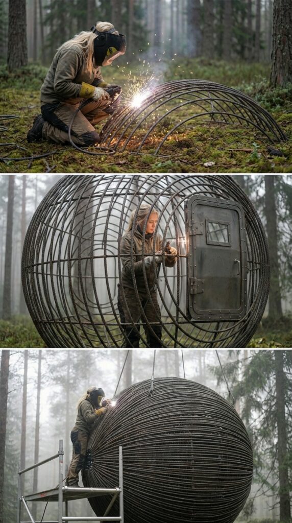 The suspended forest capsule cabin begins as a handcrafted project, carefully assembled using reinforced steel rebar shaped and welded by hand. The construction process starts with bending curved steel rods to form a strong skeletal frame, creating the rounded geometry that gives the structure its distinctive spherical appearance. Each segment is welded together with precision, forming a durable cage-like framework designed to distribute weight evenly while maintaining structural integrity. As the frame grows, additional layers of steel reinforcement are added, gradually transforming the open skeleton into a dense protective shell capable of resisting environmental stress.