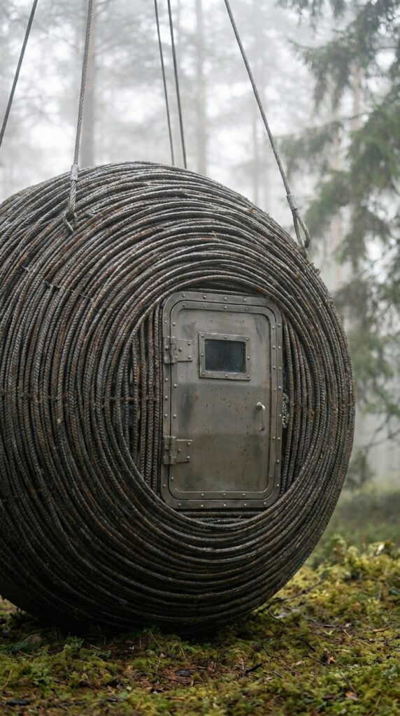 Suspended between tall forest trees, this unique hanging cabin is constructed using a reinforced armature framework that gives the structure exceptional strength and durability. The spiral exterior made from layered steel rebar creates a protective shell capable of withstanding harsh weather conditions while maintaining a compact and efficient form. Elevated above the ground with heavy-duty suspension cables, the spherical design minimizes contact with the terrain, protecting the shelter from moisture and wildlife while offering a quiet and secure retreat in nature.