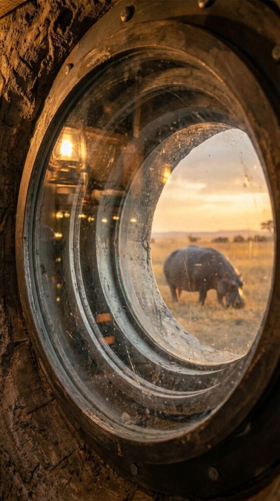 Using binoculars, cameras, or telescopes mounted near the window, observers can document natural animal behavior in remarkable detail. Animals such as giraffes, antelope, elephants, and hippos often pass through the nearby grasslands or approach water sources, creating rare opportunities for close wildlife observation and photography.