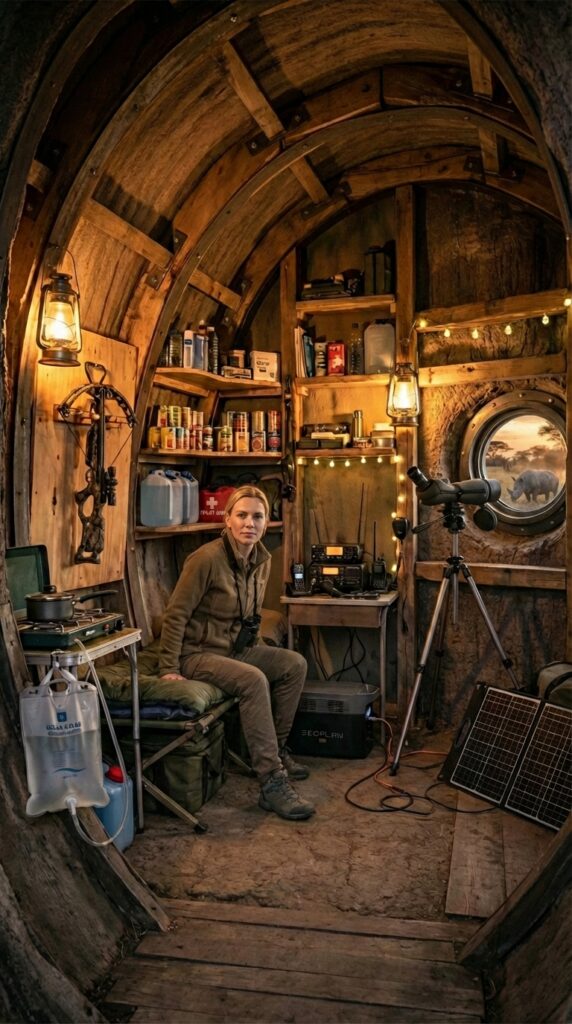 The entrance is carefully concealed within the natural texture of the tree, allowing the shelter to remain almost invisible to animals and distant observers. From the outside it looks like an ordinary hollow tree, but inside it contains a compact living space designed for long-term field work. The interior typically includes a small sleeping area, storage for food and water, communication equipment, batteries or solar-powered energy systems, and basic research gear such as cameras, lenses, and binoculars.