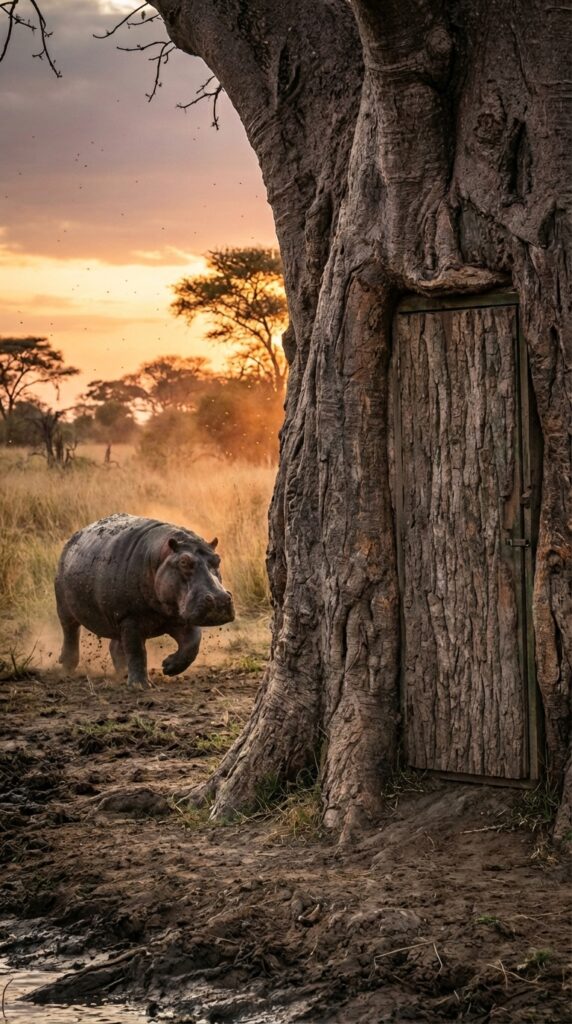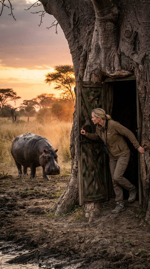 From this protected viewpoint, it becomes possible to observe rare and intimate moments of animal behavior. Large animals such as hippos often approach nearby water sources with their young, allowing researchers to study family interactions, feeding patterns, and movement through the savanna. Because the shelter is hidden within a natural tree structure, the animals remain calm and unaware of human presence.