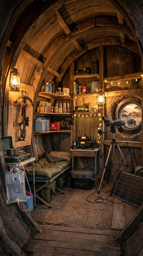The main living area includes organized shelving for food, water reserves, medical supplies, and essential equipment. A compact energy system powers lighting, communication devices, and monitoring equipment. A central table with maps and planning tools supports navigation and strategic preparation, while a comfortable seating area ensures the bunker remains livable rather than purely utilitarian.