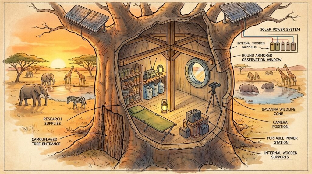 This unique wildlife observation shelter is built inside the massive trunk of an ancient baobab tree in the African savanna. Designed for researchers, wildlife photographers, and documentary teams, the shelter allows long-term observation of animals while remaining completely hidden within the natural environment.