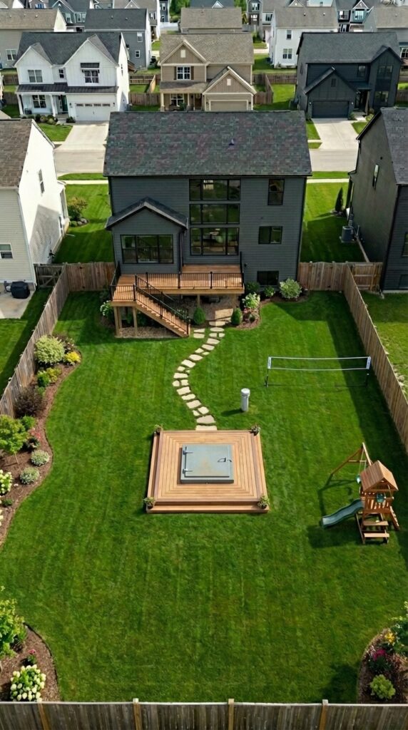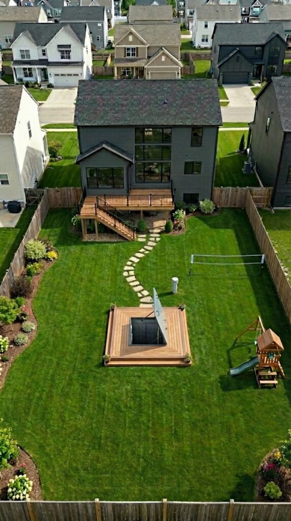 The backyard also includes typical residential features such as a children’s play structure, open lawn area for recreation, and space for outdoor activities. These elements help the yard appear completely ordinary, ensuring the underground shelter remains unnoticed.