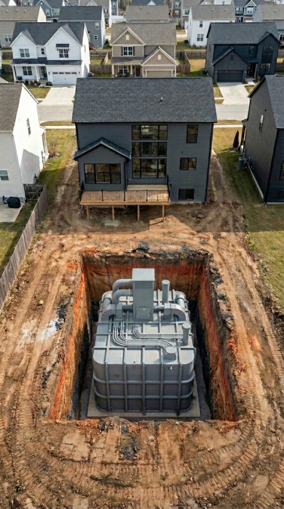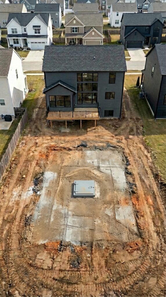 The construction begins with a large excavation in the backyard where a reinforced steel and concrete bunker module is installed several meters below ground level. The structure is engineered to withstand heavy soil pressure and environmental stress while remaining fully sealed from moisture and external contamination.