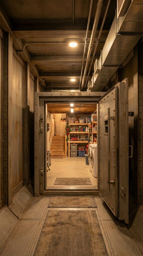 Together, the reinforced steel corridor, organized living interior, and private basement connection create a secure underground shelter system integrated directly beneath the property. The design ensures both protection and convenience while remaining hidden within a normal residential environment.
