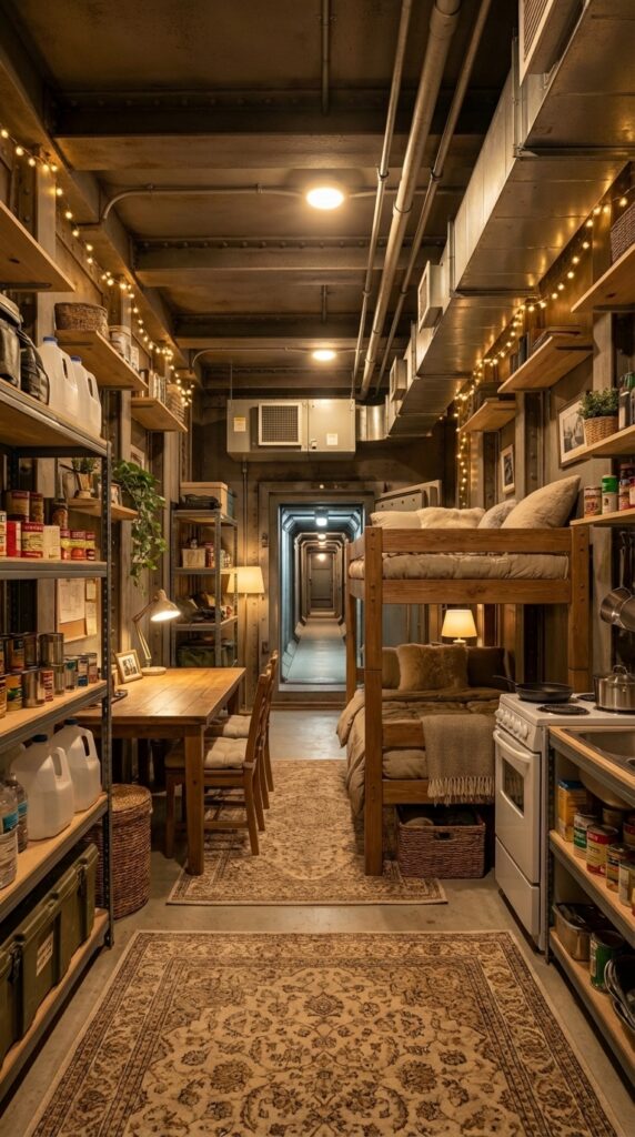 Soft lighting and wooden furniture create a warmer atmosphere inside the otherwise reinforced structure. Shelving along the walls stores canned goods, medical kits, tools, and essential supplies for extended stays underground. Ventilation systems and reinforced air ducts run along the ceiling to maintain proper airflow throughout the bunker.