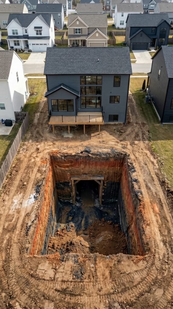 The process begins by excavating a large rectangular pit in the backyard. Heavy equipment removes several meters of soil to create space for the bunker structure. The excavation is carefully shaped to support the installation of a prefabricated reinforced bunker module.