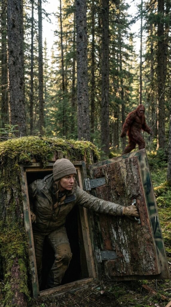 Near the entrance stands a reinforced bunker door built from heavy steel, designed to secure the shelter from outside threats. The door connects to the underground tunnel system that leads to the hidden forest exits.