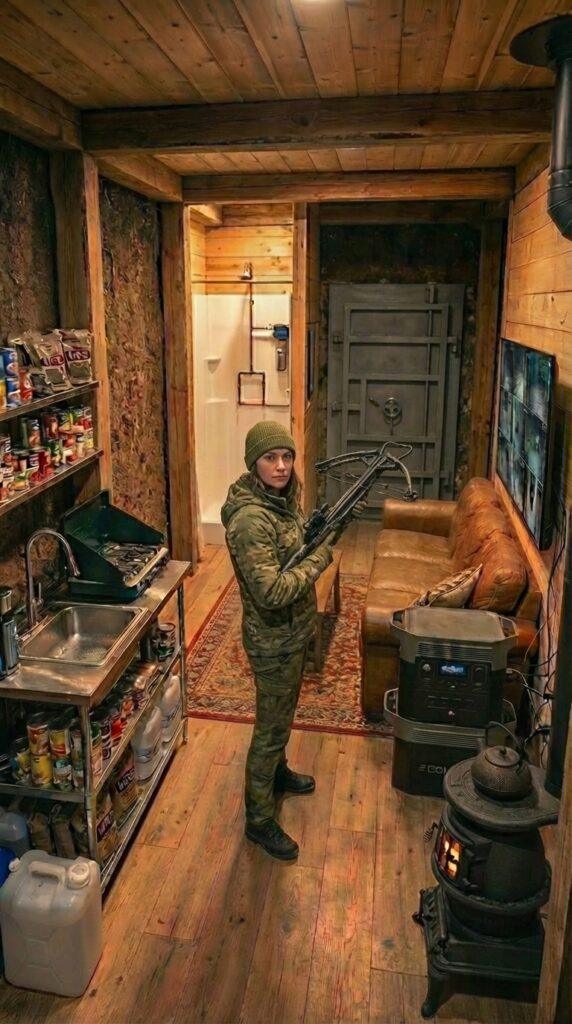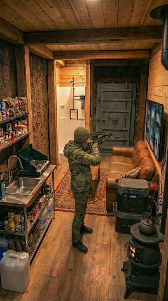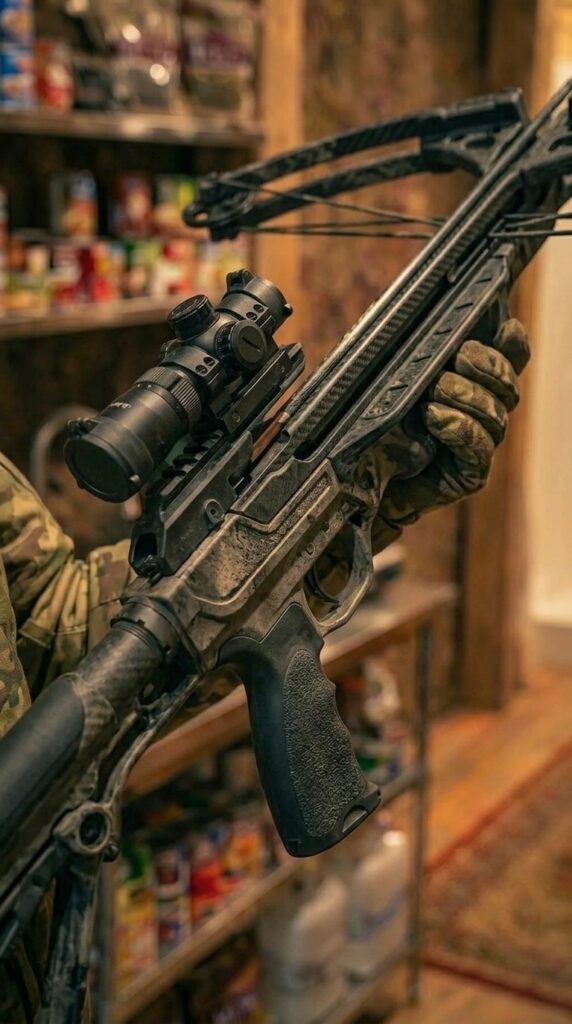 Inside the bunker, one of the essential tools for protection and hunting is a modern tactical crossbow. Unlike firearms, a crossbow provides a quiet and reliable way to defend the shelter or hunt for food without producing loud noise that could reveal a hidden location.