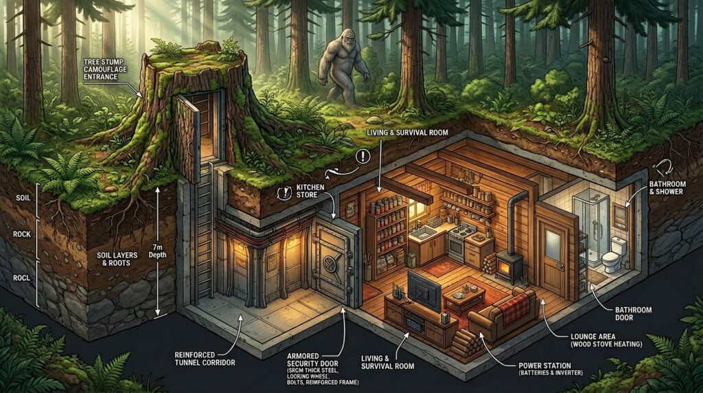 Hidden beneath the forest floor and protected by natural camouflage, this bunker design combines practical survival engineering with discreet integration into the surrounding environment. The tree stump entrance, reinforced corridor, armored security door, and fully functional living space create a secure and self-sufficient underground refuge in the wilderness.