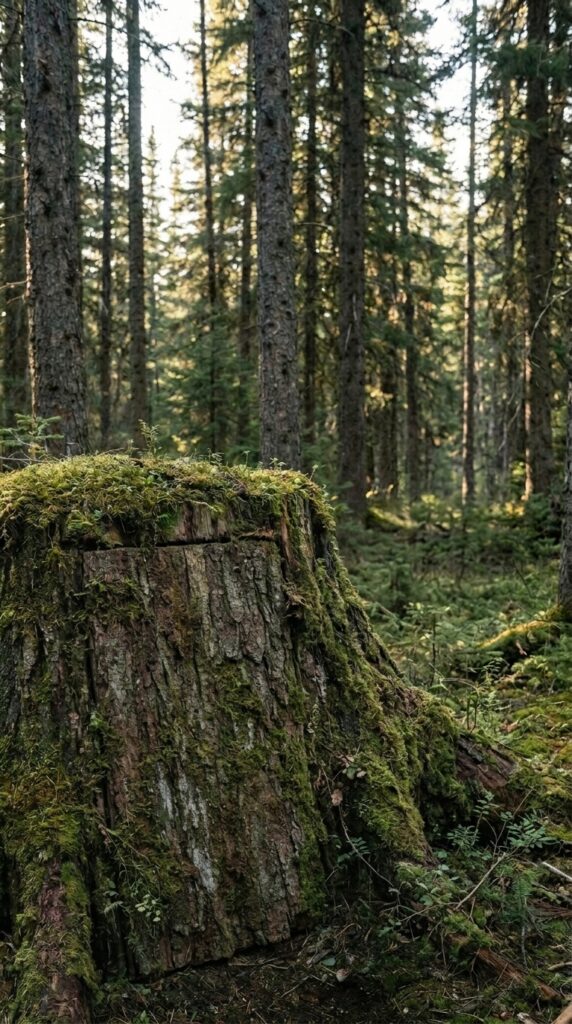 Deep within a dense forest, surrounded by tall pine trees and thick moss, an ordinary looking tree stump hides a secret entrance to an underground survival bunker. From the outside, the stump blends naturally with the surrounding forest floor, covered in moss, bark, and forest debris, making it nearly impossible to notice.