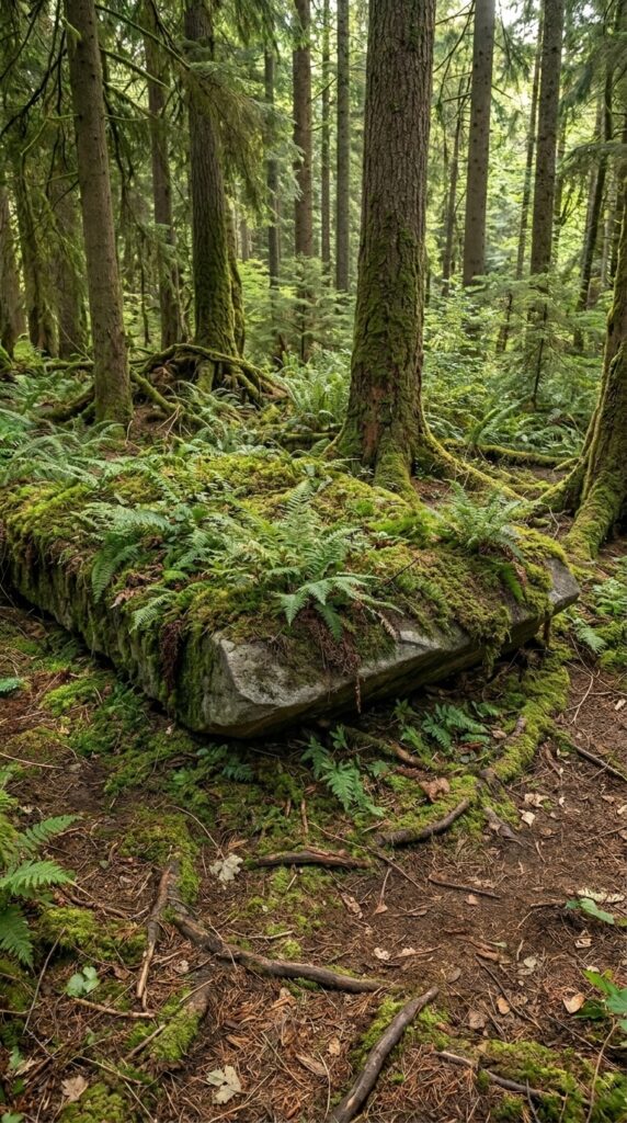 From the outside, the structure appears to be nothing more than a moss-covered boulder surrounded by ferns, roots, and forest debris. The stone blends naturally into the environment, making it extremely difficult for anyone passing by to notice that it hides a concealed structure beneath it.