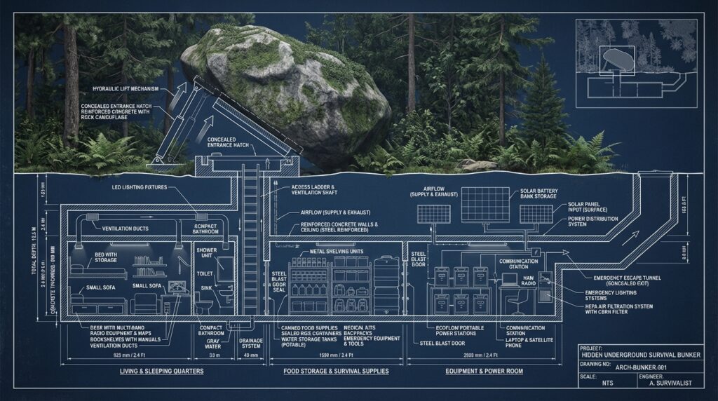 In remote wilderness environments, one of the most effective ways to conceal an underground shelter is by integrating the entrance directly into natural surroundings. This bunker design uses a massive natural-looking rock as a camouflage hatch, allowing the entrance to remain virtually invisible within the forest landscape.