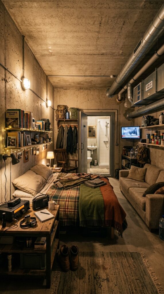 The room also includes personal storage shelves where books, survival guides, clothing, and small personal items are kept organized. These shelves help create a sense of normal living space even during extended bunker stays.