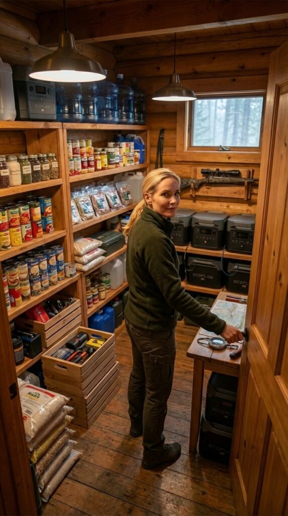 The living area features a comfortable sofa, wooden furniture, and practical storage shelves filled with canned food, water containers, and survival supplies. Everything is carefully organized to ensure long-term sustainability in a remote wilderness environment.