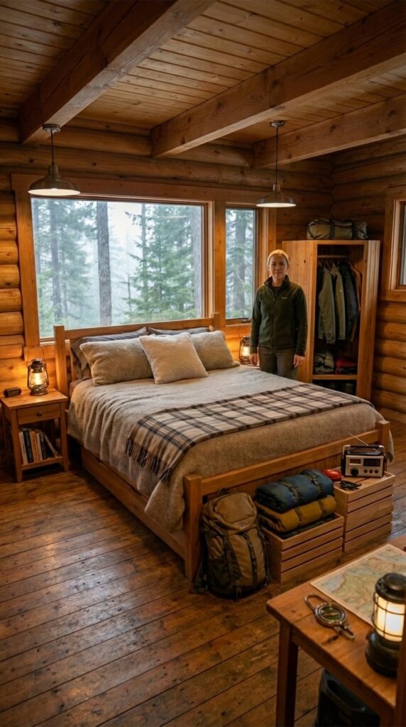 The bedroom of the survival cabin is designed to provide warmth, comfort, and rest after long days in the wilderness. A large wooden bed sits in the center of the room with thick blankets and pillows, creating a cozy place to sleep even during cold Alaska nights. Large windows surround the sleeping area, offering a peaceful view of the forest while still allowing the owners to observe their surroundings. Next to the bed there are lanterns, emergency gear, backpacks, and essential survival equipment stored in wooden crates, ensuring that everything needed for a quick evacuation is always within reach. The room combines comfort with preparedness, making it both a relaxing and strategic space.