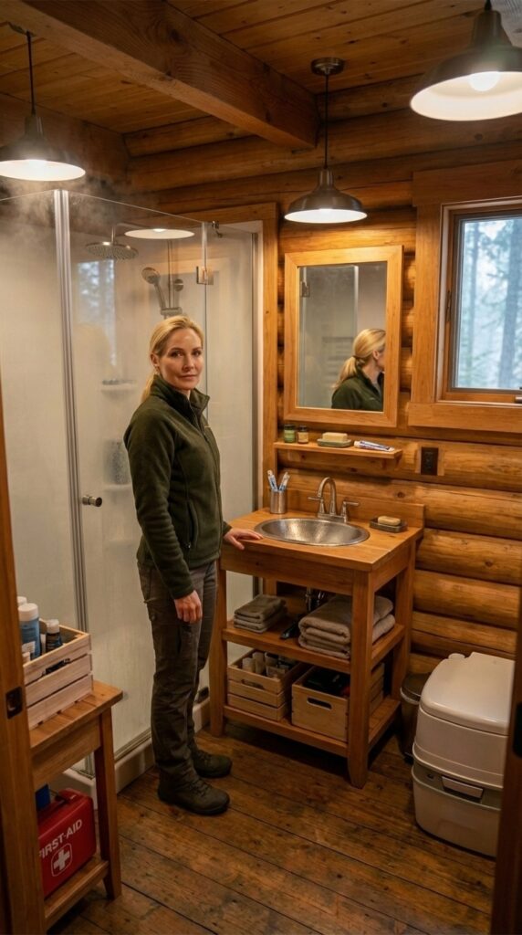 The cabin also includes a compact but fully functional off-grid bathroom. Inside there is a shower cabin, a sink with storage for hygiene supplies, and a composting toilet designed for remote living. Water for the bathroom is pumped from a well outside the property and stored in tanks before being heated with electric power generated by the off-grid energy system. Even in the middle of the wilderness, the residents can maintain comfort and basic hygiene while living independently from public infrastructure.