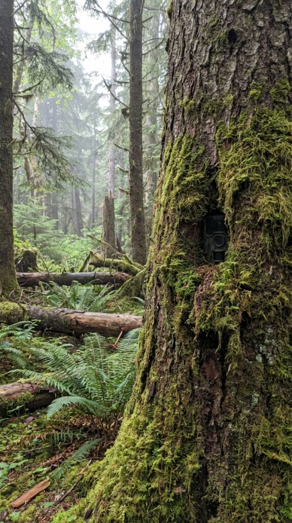 The placement of the camera inside the tree provides several advantages. Elevated above ground level, it offers a wider viewing angle of the forest area while remaining protected from weather and wildlife. Moss and natural tree textures help disguise the device, ensuring it cannot easily be detected by someone walking through the forest.
