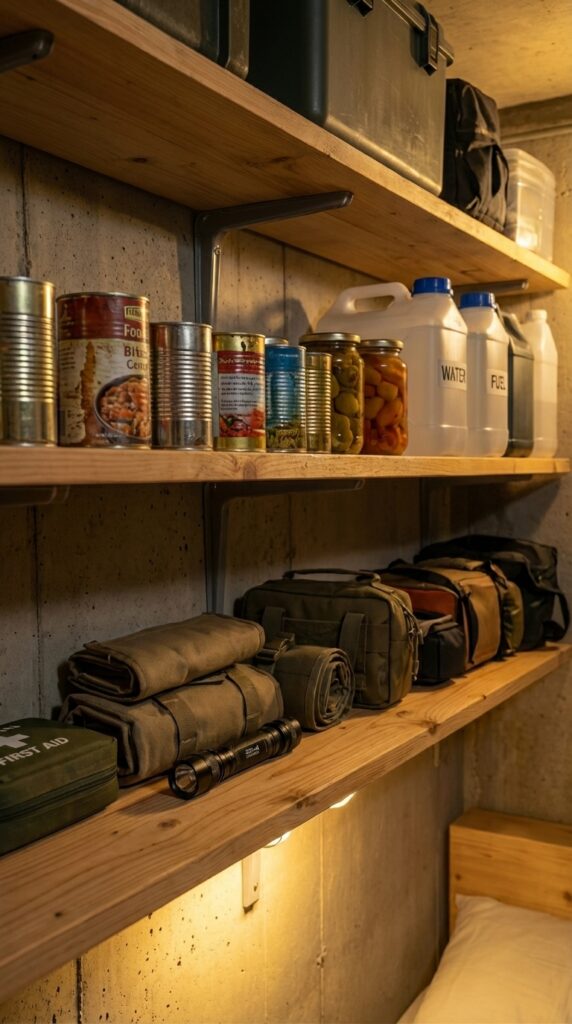 Along one side of the room, strong wooden shelves hold carefully organized survival supplies. These include canned food, preserved goods, drinking water containers, medical kits, emergency equipment, and packed gear for quick evacuation if necessary. Everything is arranged to ensure long-term storage while remaining easily accessible.