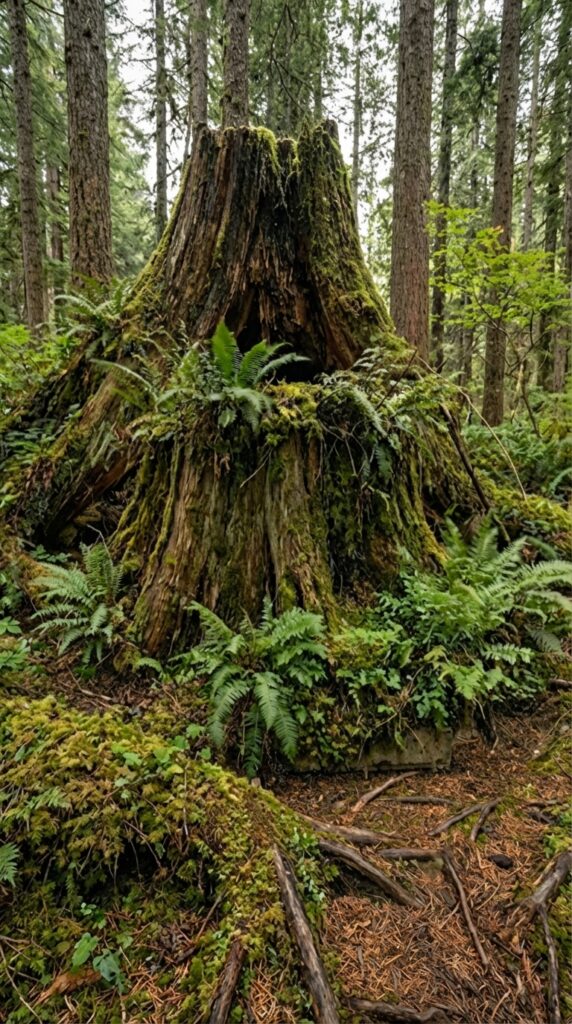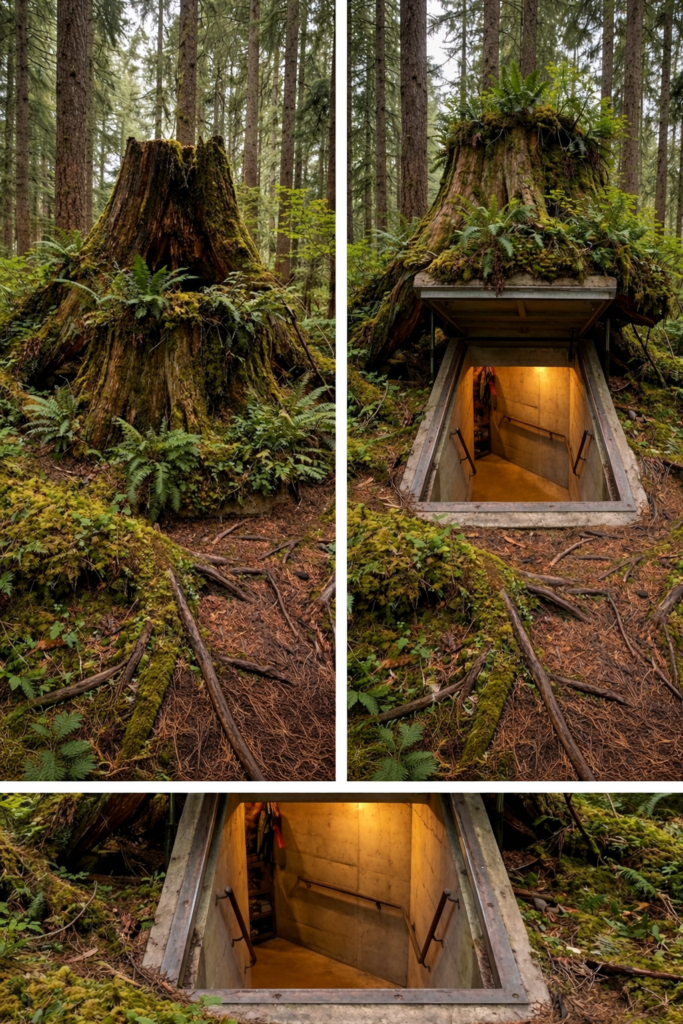 Deep within the forest, what appears to be nothing more than an old moss-covered tree stump hides the entrance to a carefully designed underground bunker. Blending naturally into the surrounding landscape, the stump is covered with moss, ferns, and forest plants, making it almost impossible to distinguish from the rest of the woodland environment.