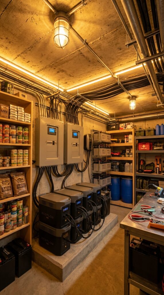 Shelves surrounding the room store additional emergency supplies, tools, water containers, and long-term food reserves. Keeping these items close to the power systems ensures that critical equipment can be maintained and repaired if needed.