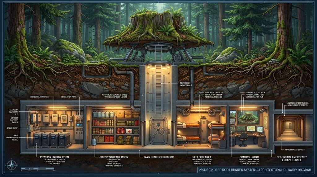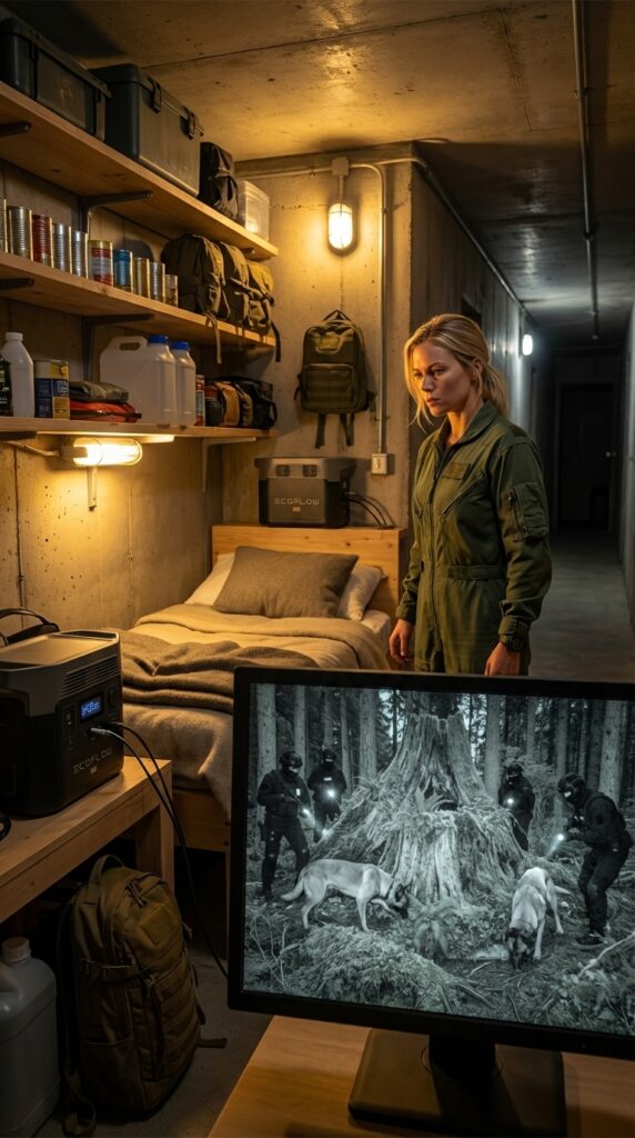 Portable power stations and backup batteries provide electricity for lighting, communication equipment, and surveillance systems. Combined with well-organized storage and sleeping areas, the bunker interior creates a secure underground shelter designed to support occupants safely during extended periods below ground while remaining hidden beneath the natural forest landscape.