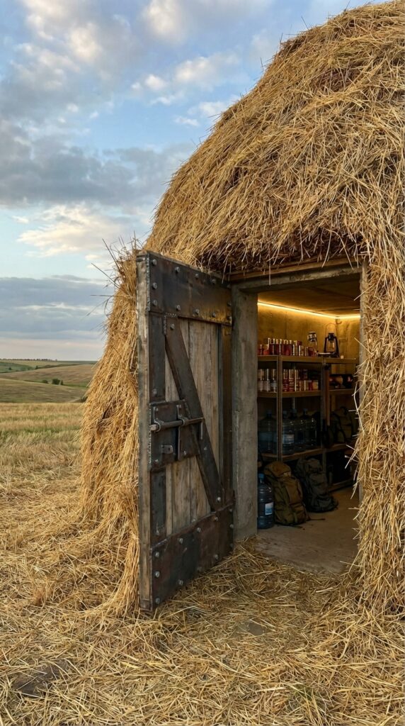 Behind the outer layer of hay sits a heavy steel and wood door set into a solid concrete frame. The structure is designed to blend perfectly into the surrounding field so that from a distance it appears to be nothing more than farm storage. Straw covers the edges of the doorway, masking the bunker entrance and making it almost impossible to notice unless you know exactly where to look.
