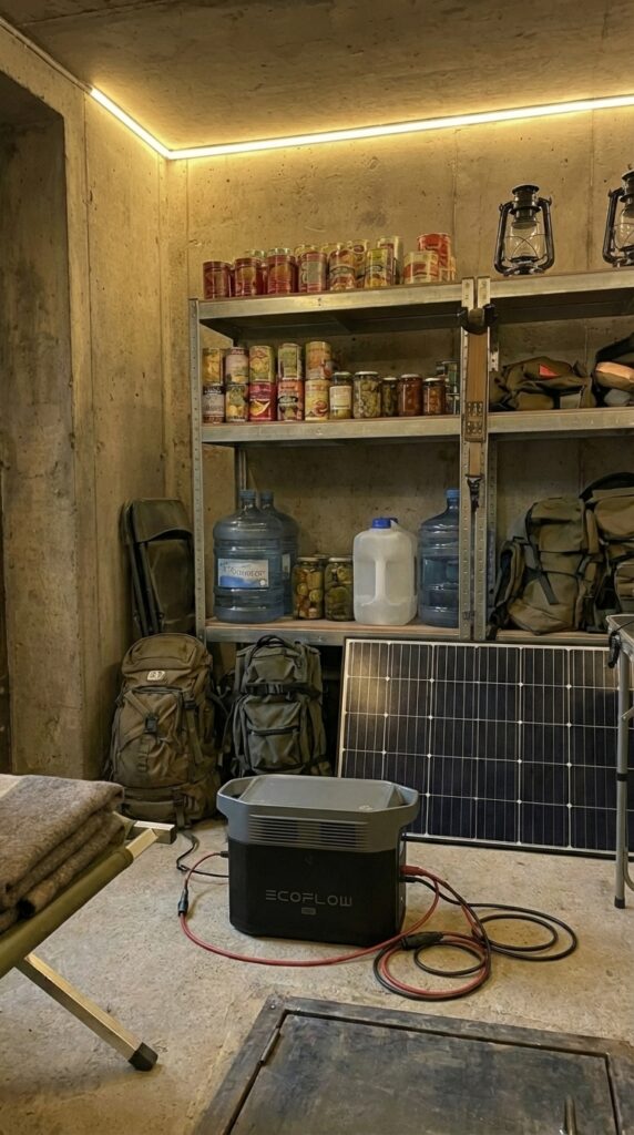 Inside the bunker, the space is organized as a compact survival shelter. Strong metal shelves hold canned food, preserved supplies, water containers, and emergency equipment. Backpacks and basic gear are stored nearby so they are ready if needed. A portable EcoFlow power station provides electricity for the interior lighting, allowing the bunker to remain functional even without external power sources.