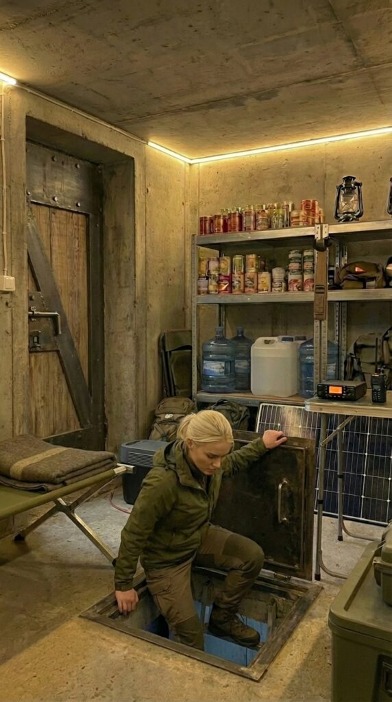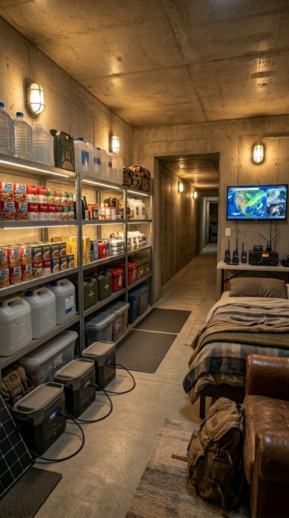 Inside the bunker, careful attention has been given to storing essential supplies that could support survival for an extended period of time. Along the reinforced concrete walls stand strong metal shelves filled with canned food, preserved vegetables, and long-lasting emergency rations. These types of foods are ideal for bunker storage because they can remain usable for months or even years without refrigeration.