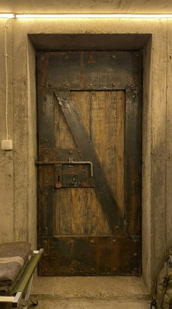 The entrance is secured by a massive bunker door built from a combination of thick steel plates and heavy wooden panels. Large metal bolts and reinforcing bars strengthen the frame, making the door extremely durable and resistant to forced entry. A solid locking mechanism and steel crossbar secure the door from the inside, creating an additional layer of protection.
