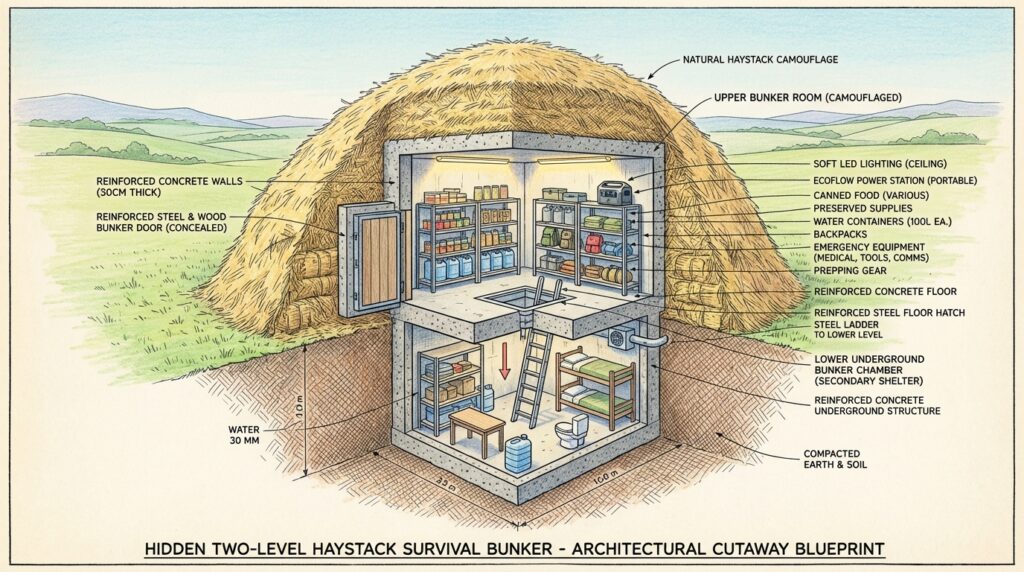 This simple but clever design transforms an ordinary haystack into a hidden two-level bunker. By combining natural camouflage with reinforced construction and organized supplies, the structure becomes a discreet and practical survival shelter concealed in plain sight.