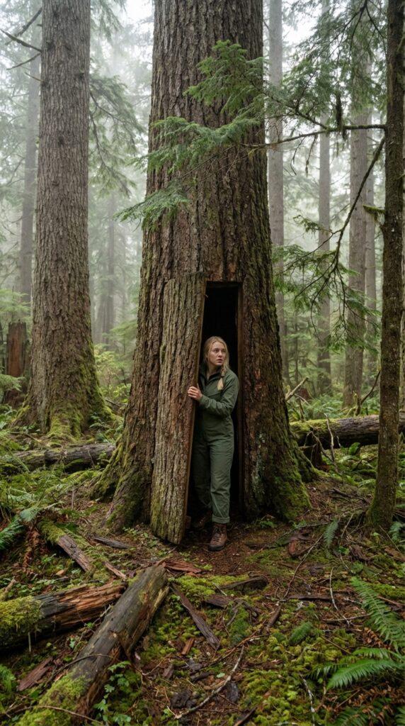 Inside the tree, a concealed wooden door blends with the inner bark. When closed, it becomes nearly invisible from outside. The occupant can quietly push the door open from within the trunk and step directly into the forest.