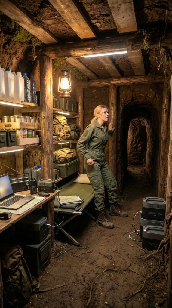 Inside, the bunker is carved directly into the earth and reinforced with wood and compact soil. Shelves hold canned food, water containers, survival gear and emergency supplies. LED lighting powered by portable energy stations keeps the underground space warm and functional.