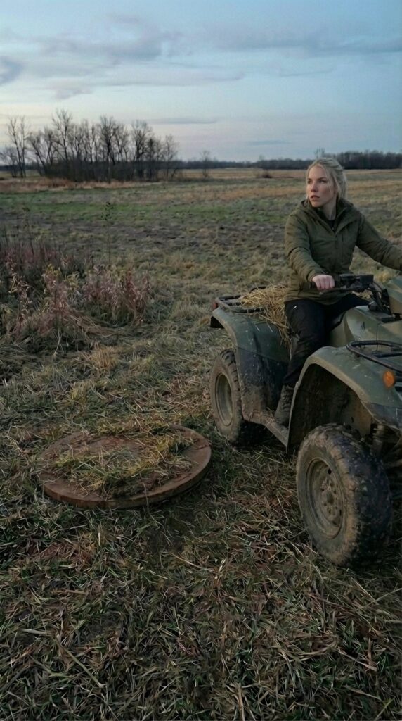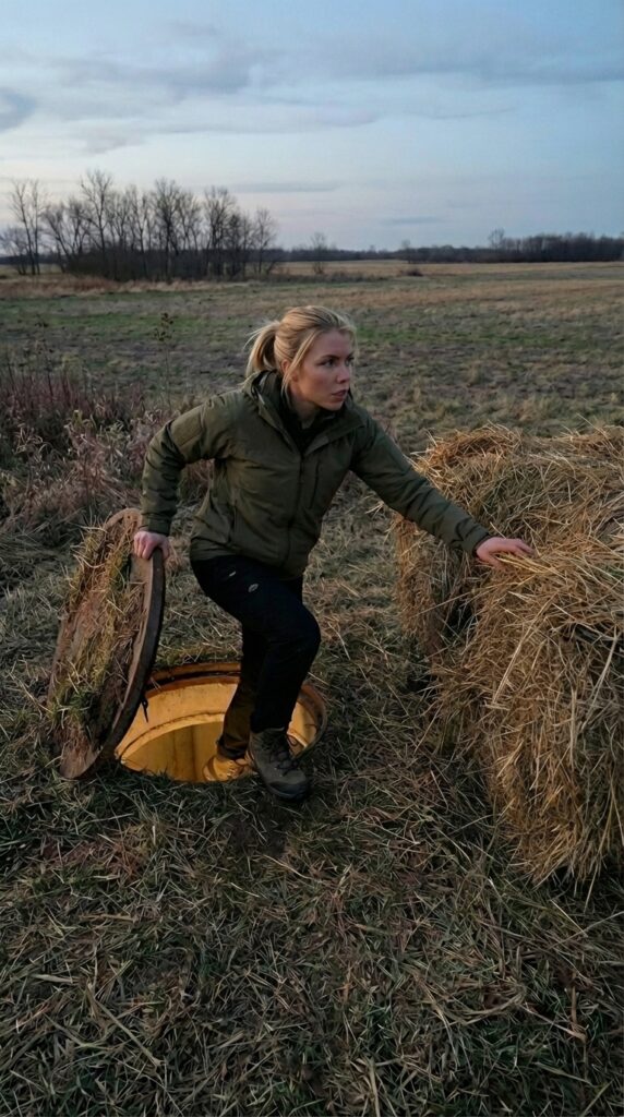 The hay bale actually hides a reinforced steel hatch built directly into the ground. The top of the hatch is covered with a thick layer of straw so that from the outside it blends perfectly with the surrounding hay. Unless someone knows exactly where to look, it is almost impossible to notice that an entrance is hidden beneath the pile.