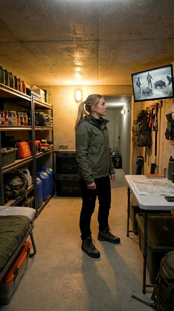 Along one side of the bunker, sturdy metal shelving units are carefully organized with preserved food, canned supplies, jars of vegetables, water containers, and essential survival equipment. Backpacks, tools, and emergency gear are kept ready in case quick movement or evacuation becomes necessary. The layout is designed to maximize storage while keeping everything easily accessible.