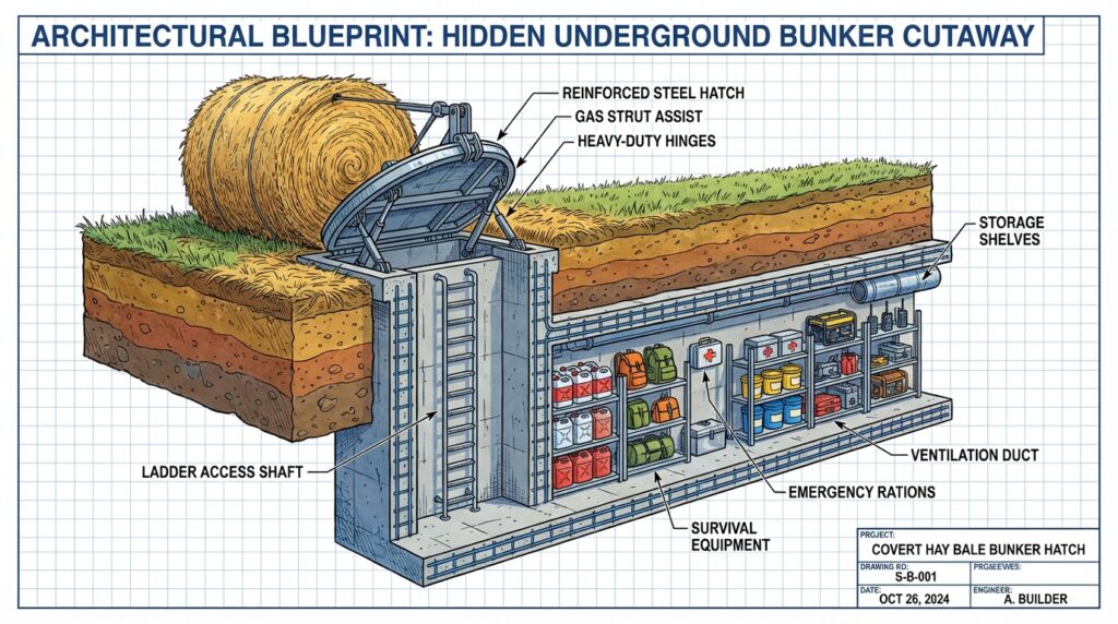 This clever design turns a simple hay bale into a hidden entrance to a secure underground shelter. By using natural farm elements as camouflage, the bunker remains almost invisible while still providing a reliable place for supplies and emergency refuge beneath the countryside landscape.