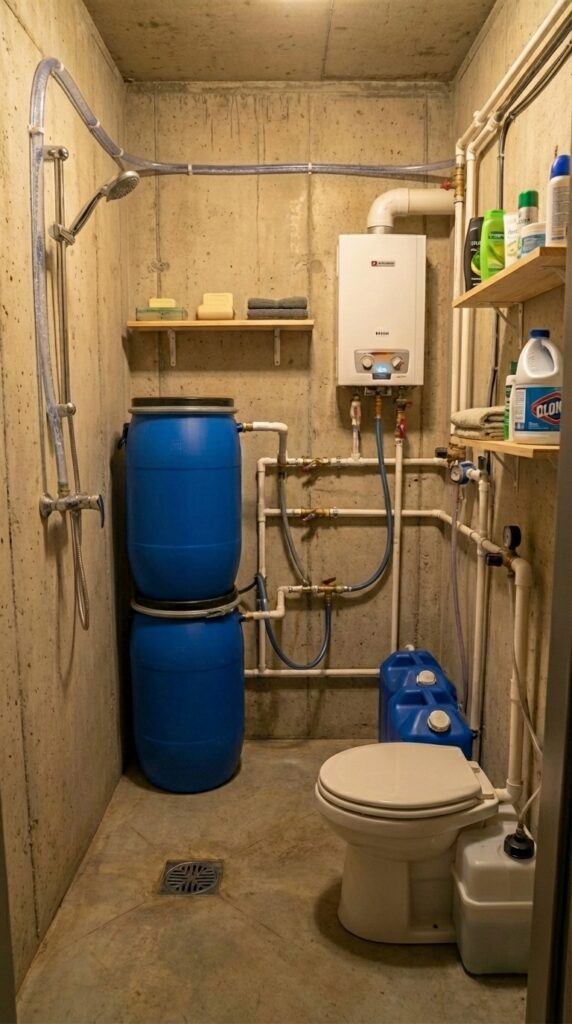 The bathroom includes a simple shower system connected to stored water tanks that supply clean water when needed. Large reserve water barrels are installed to ensure a reliable water supply for extended stays inside the bunker. These tanks store enough water for washing, cleaning, and basic daily use.