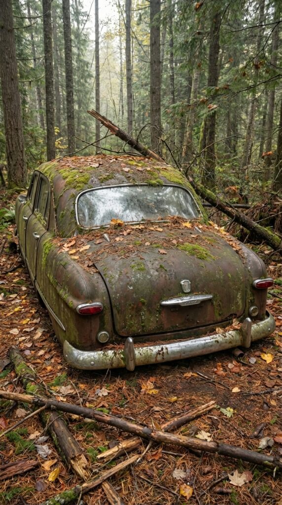 Deep in the forest, an old abandoned car slowly disappears beneath layers of moss, fallen leaves, and years of natural decay. At first glance it looks like nothing more than a forgotten vehicle left behind decades ago. Rust covers the body, branches rest on the roof, and the surrounding forest slowly reclaims what once belonged to civilization. Yet beneath this seemingly ordinary scene hides a carefully concealed bunker entrance.