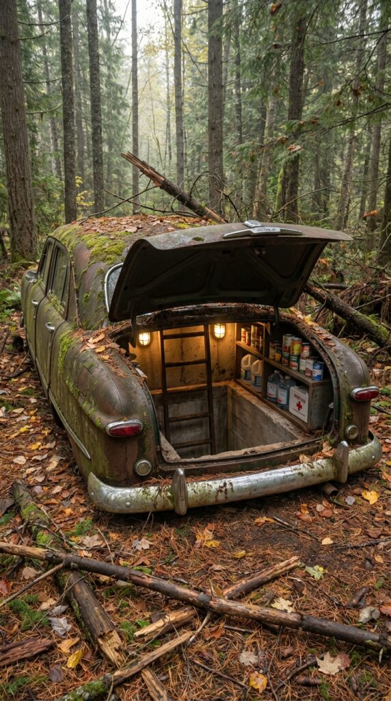 The trunk of the car acts as a hidden access point to an underground survival shelter. When opened, instead of a normal storage compartment it reveals a reinforced shaft with a ladder descending deep below the forest floor. Warm lights illuminate the concrete walls of the entrance tunnel, guiding the way down into the hidden bunker.