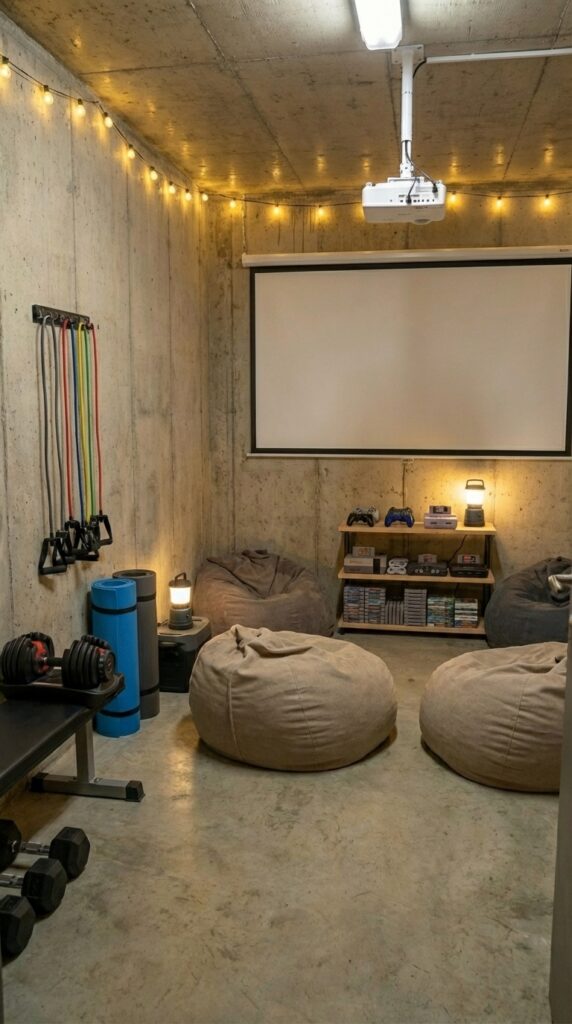 The room features a large projection screen mounted on the concrete wall, paired with a ceiling projector that transforms the bunker into a small private cinema. Comfortable beanbag seating creates a relaxed atmosphere where occupants can watch movies, play video games, or follow important broadcasts when needed.