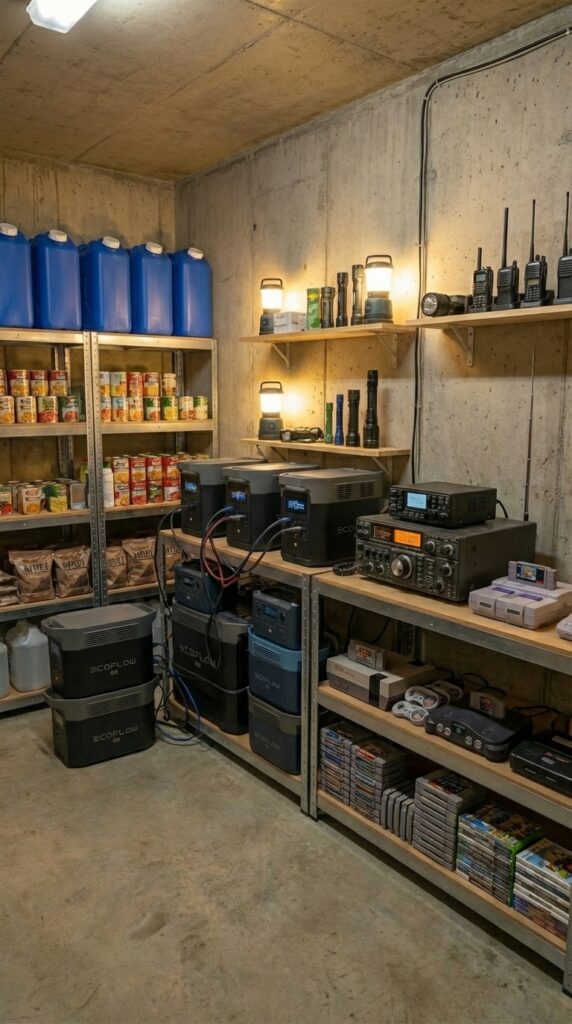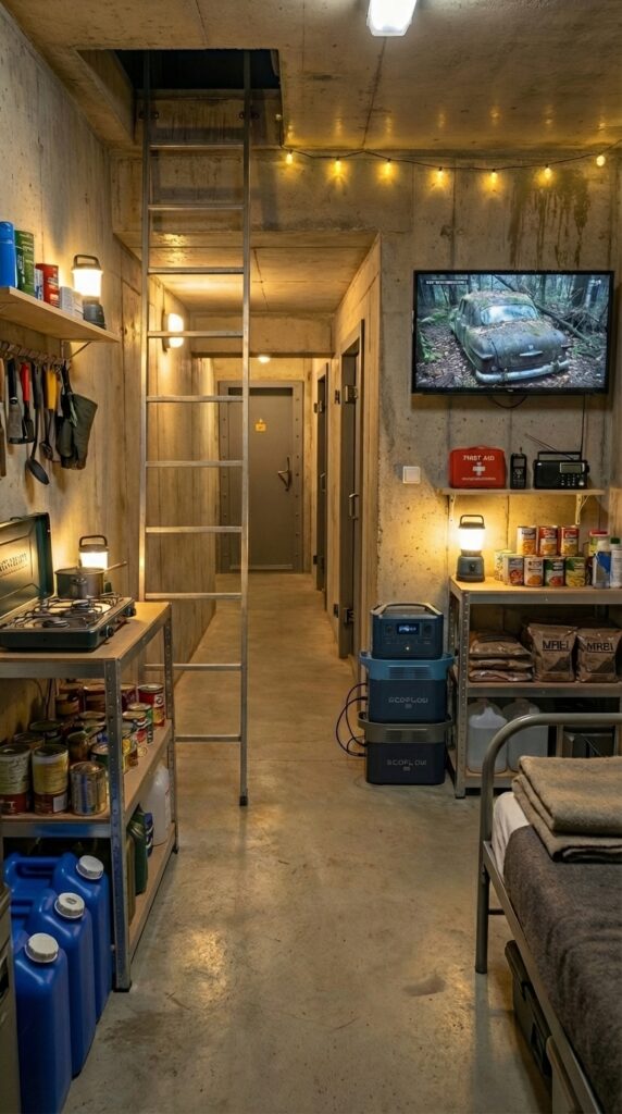 Additional shelves store flashlights, lanterns, survival gear, medical kits, and other essential equipment needed for emergencies. Entertainment systems and game consoles are also included to help maintain morale during extended stays below ground.