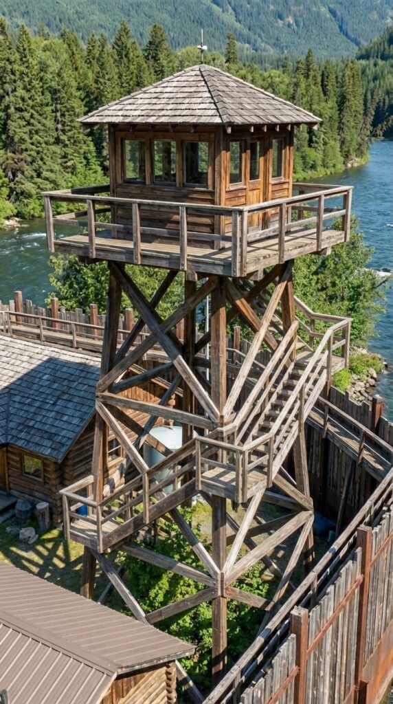 The tower platform is also used as a lookout position. From here, the surrounding terrain can be observed day or night, providing an early warning system for any unusual activity around the island. With such a wide field of view across the river and forest, the tower becomes the central observation point for the entire settlement.