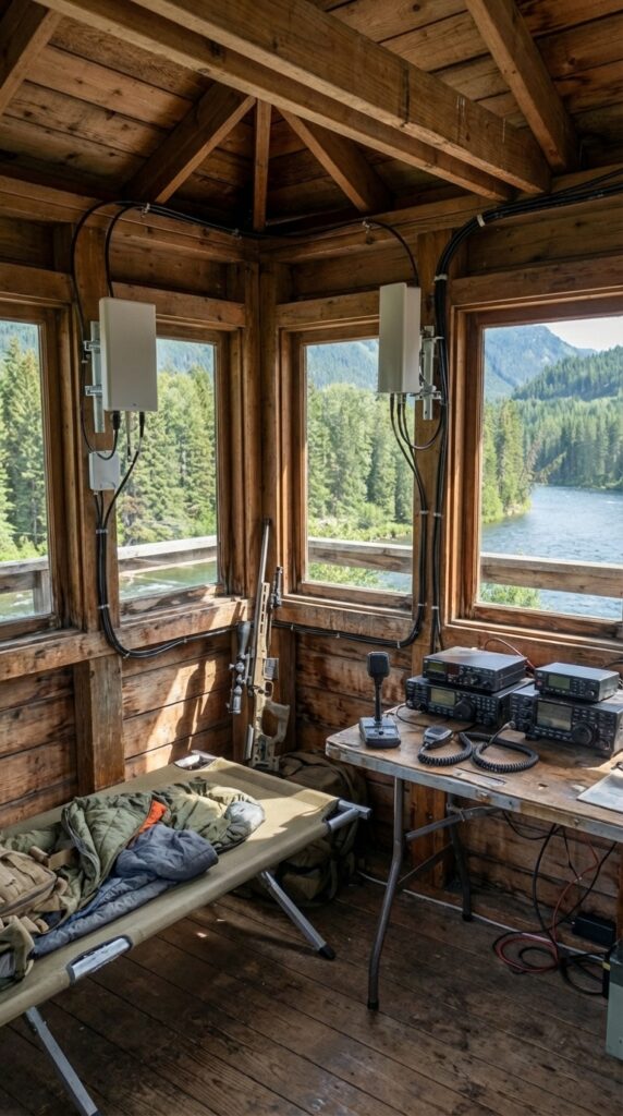 Inside the observation platform is a radio communication station equipped with long-range radios. These radios allow contact with nearby settlements, boats on the river, or emergency services if necessary. In remote wilderness environments, reliable radio communication is often the most important backup when other networks are unavailable.