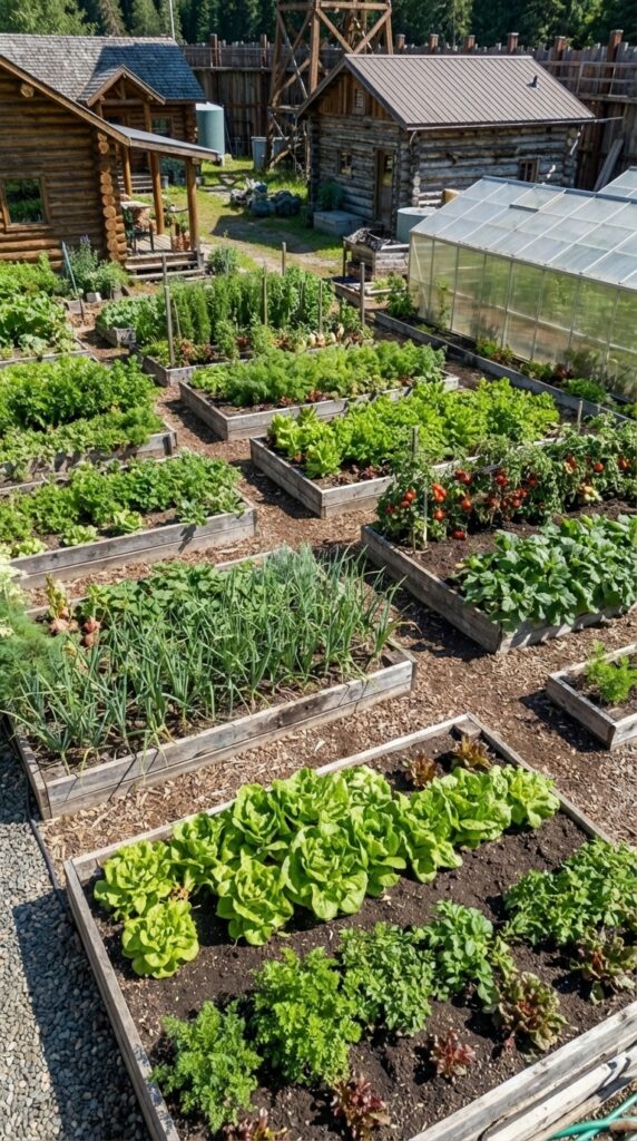 The open garden beds are carefully arranged in organized rows, allowing different types of crops to be grown throughout the season. These beds can be used to grow potatoes, carrots, onions, beans, cabbage, tomatoes, and many other vegetables that are reliable for survival farming. With proper planning, the garden can produce enough food during the warm months to supply the residents with fresh vegetables and also provide harvests that can be stored for winter.