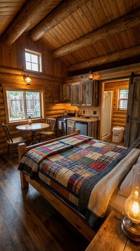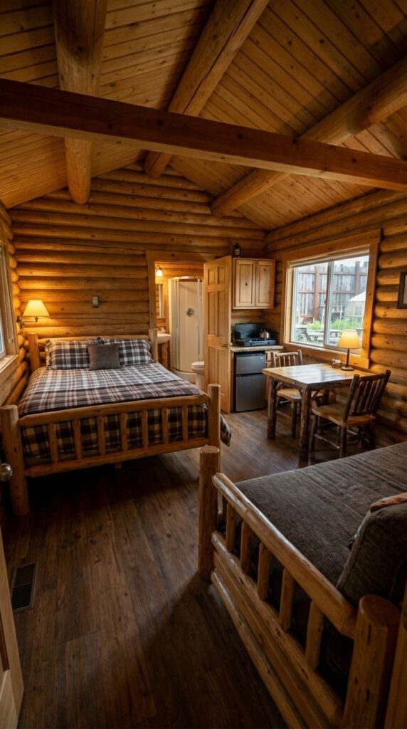 Next to the storage building are two cozy residential cabins built from thick wooden logs. These homes provide warm and comfortable living spaces designed for life in the wilderness. Inside, the cabins feature simple but practical interiors with wooden beds, small kitchen areas, dining tables, and natural lighting from large windows overlooking the island.