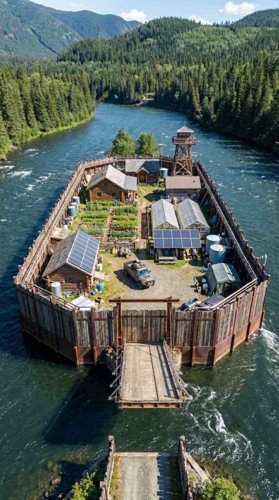 Deep in the wild forests of Alaska, surrounded by a powerful river and endless mountains, sits a small fortified island designed for complete off-grid living and long-term survival. From above, the island looks like a remote self-sufficient settlement protected by a strong wooden perimeter wall that surrounds the entire property. The only way to reach the island is by a narrow wooden bridge with a large reinforced gate that can be closed to secure the entrance.