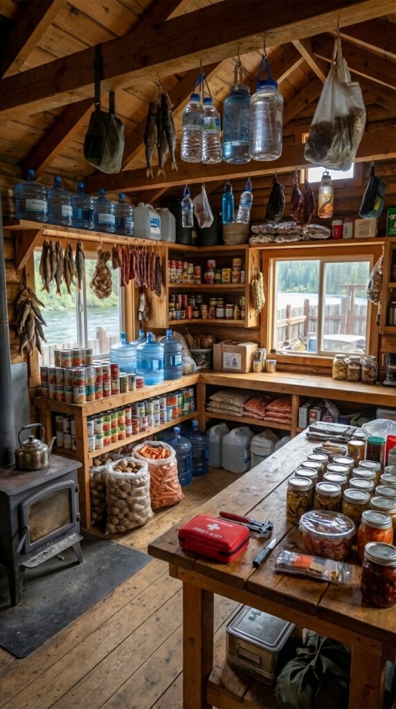 The supply cabin is designed to store large reserves of essential provisions needed for long-term off-grid living. Inside, wooden shelves are carefully organized with rows of canned food, preserved vegetables, dry goods, and emergency rations. Large water containers are stored along the walls, ensuring a reliable supply of clean drinking water. The cabin also contains tools, medical kits, survival equipment, and extra supplies that can sustain the island residents for months if necessary.