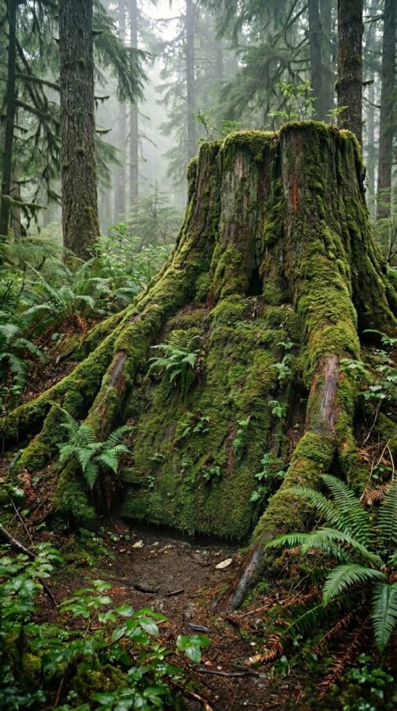 At first glance, this massive tree stump appears to be nothing more than a natural part of the forest landscape. Covered in thick moss, ferns, and small forest plants, it blends perfectly into the surrounding woodland. The rough bark, exposed roots, and layers of vegetation make it look like an old tree that was cut down decades ago and slowly reclaimed by nature.