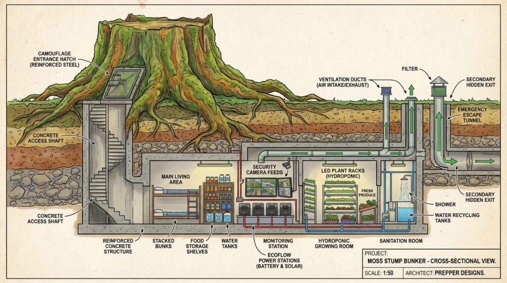 This blueprint demonstrates the design of a concealed underground survival bunker hidden beneath a massive moss-covered tree stump deep in the forest. From the surface, the location appears completely natural. The old stump, surrounded by ferns, roots, and forest vegetation, blends perfectly into the landscape, making it an ideal camouflage for a hidden entrance.
